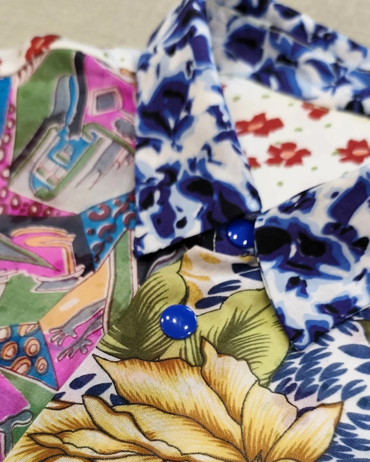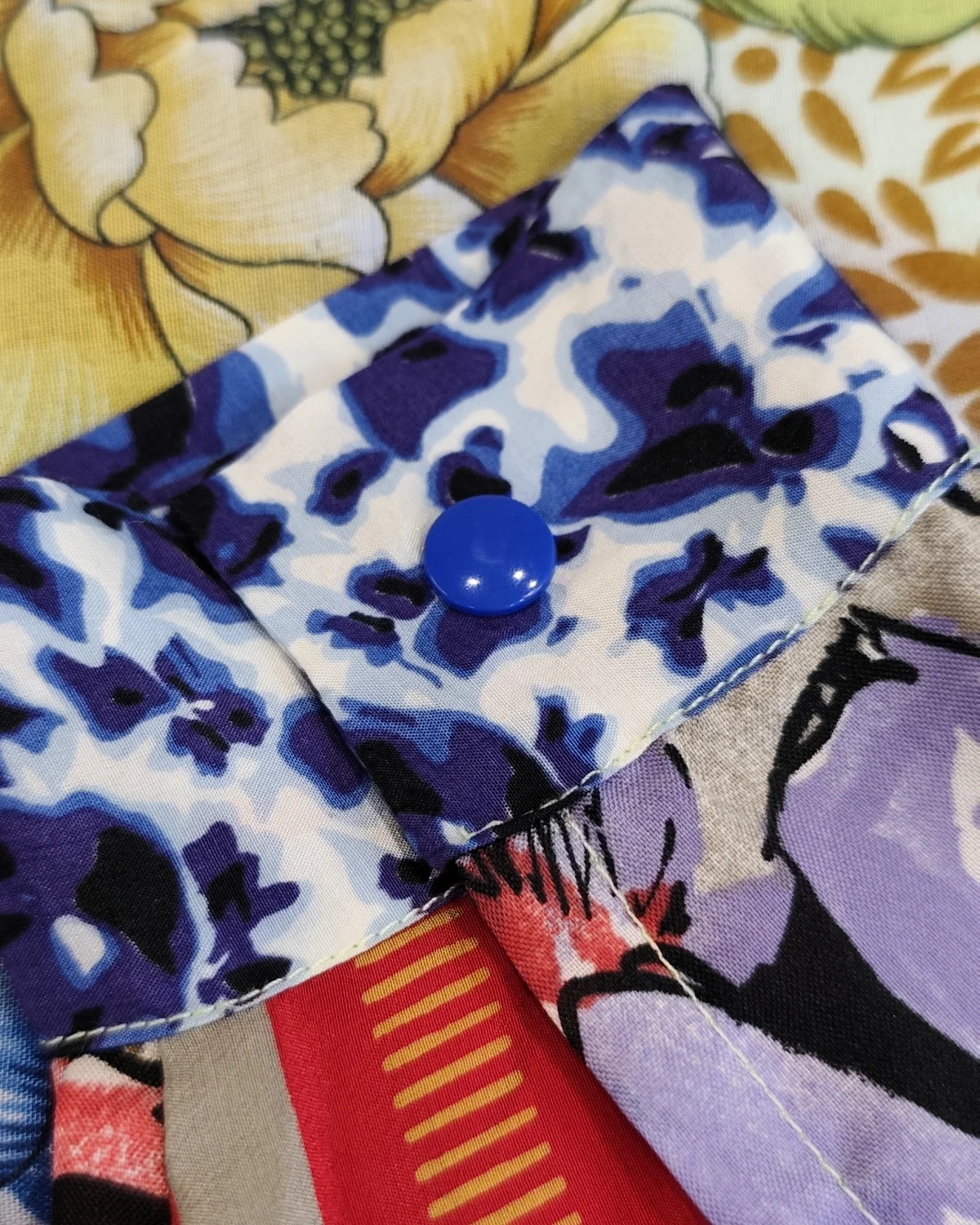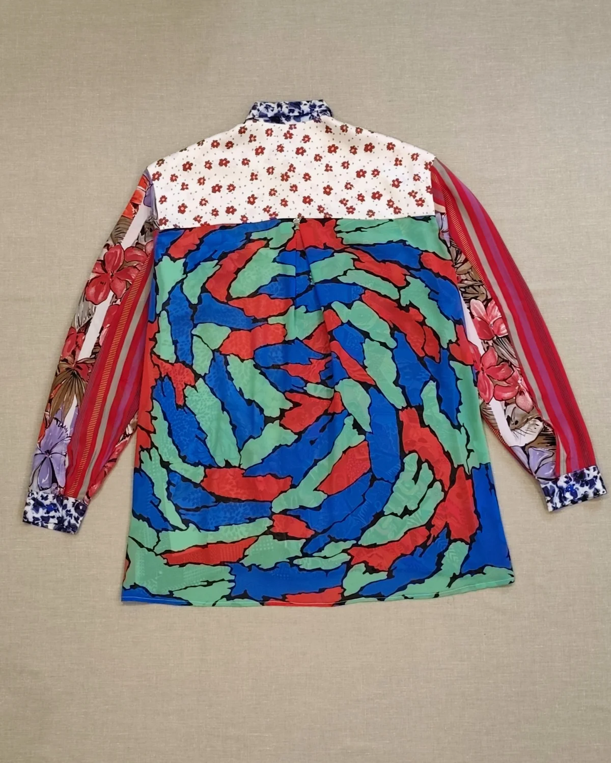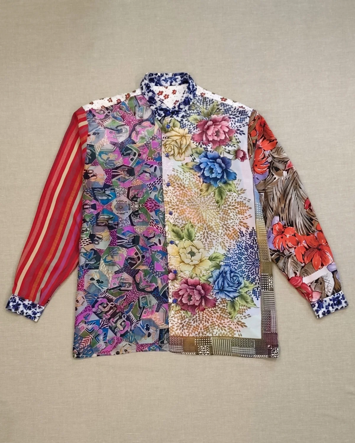 Koszula została uszyta z materiałów bawełnianych, jedwabnych i poliestrowych.